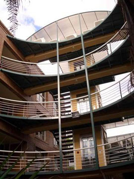 Puentes curvos y barandas de doble curvatura que enfatizan y enmarcan el patio central.